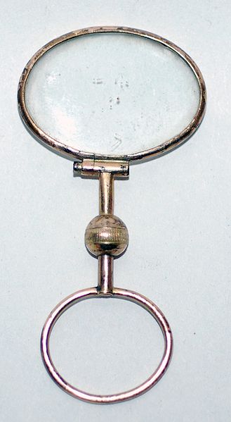 The quizzing glass, also familiarly called a “quizzer,” was a fashion accessory used by both men and women for about a hundred years, from Georgian period thru the mid-nineteenth century, although portraits depict similar devices being worn as far back as the 16th century.