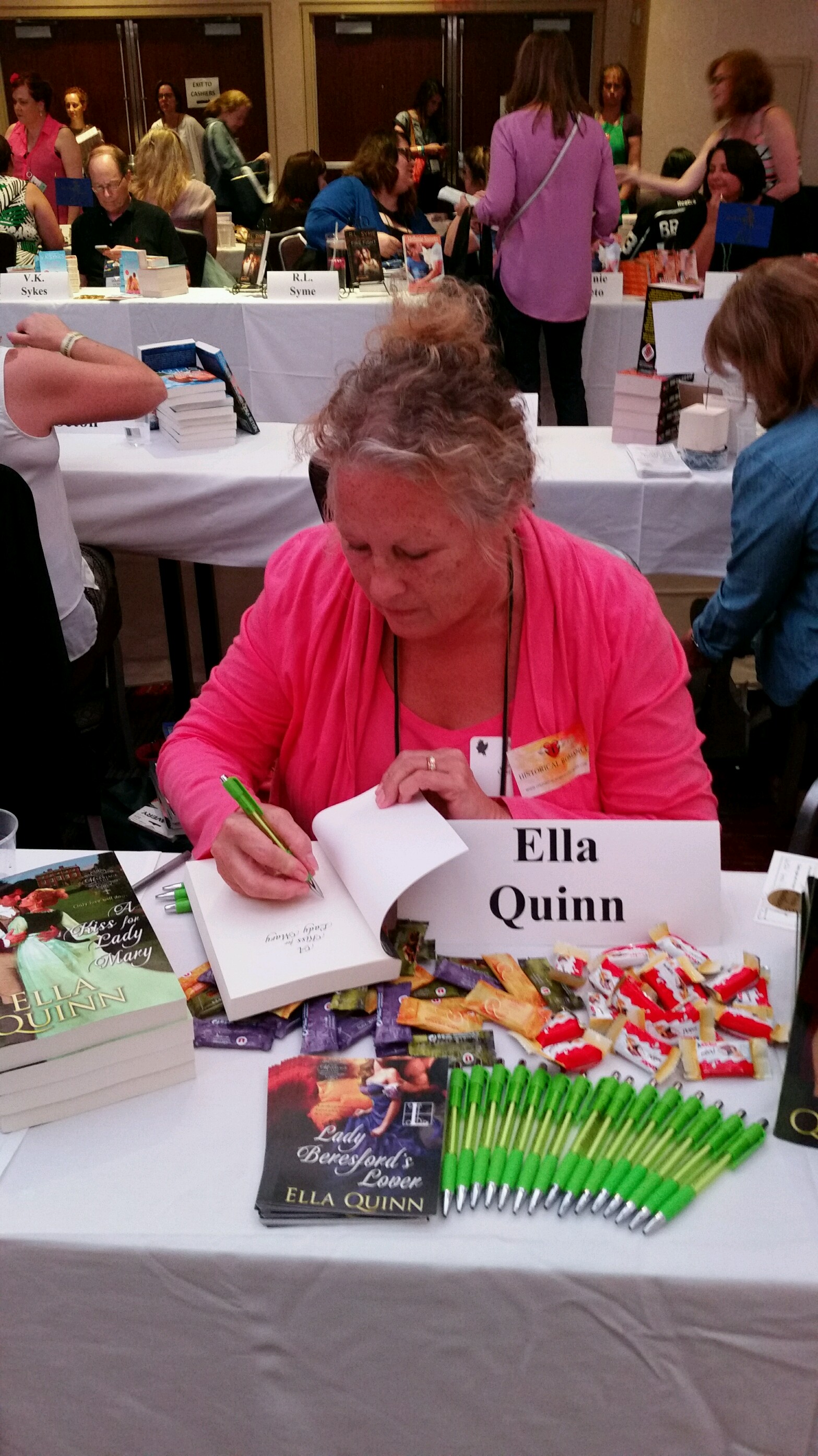 Starting with last night’s Literacy Signing. I helped Ella Quinn set up. I fan girled out at Historical romance icons Jo Beverley and Mary Jo Putney (bought books from each).