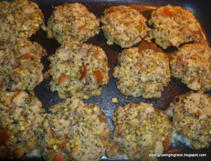 Crumble cornbread into large bowl. Add 1/4 package of stuffing mix (for a gluten-free version I have used gluten-free croutons. This year I’ve found actual gluten-free stuffing mix!) and enough chicken or turkey broth to moisten. Shape into cakes and put in greased pan. Bake at 300 for about 40 minutes or until firm and cooked through.