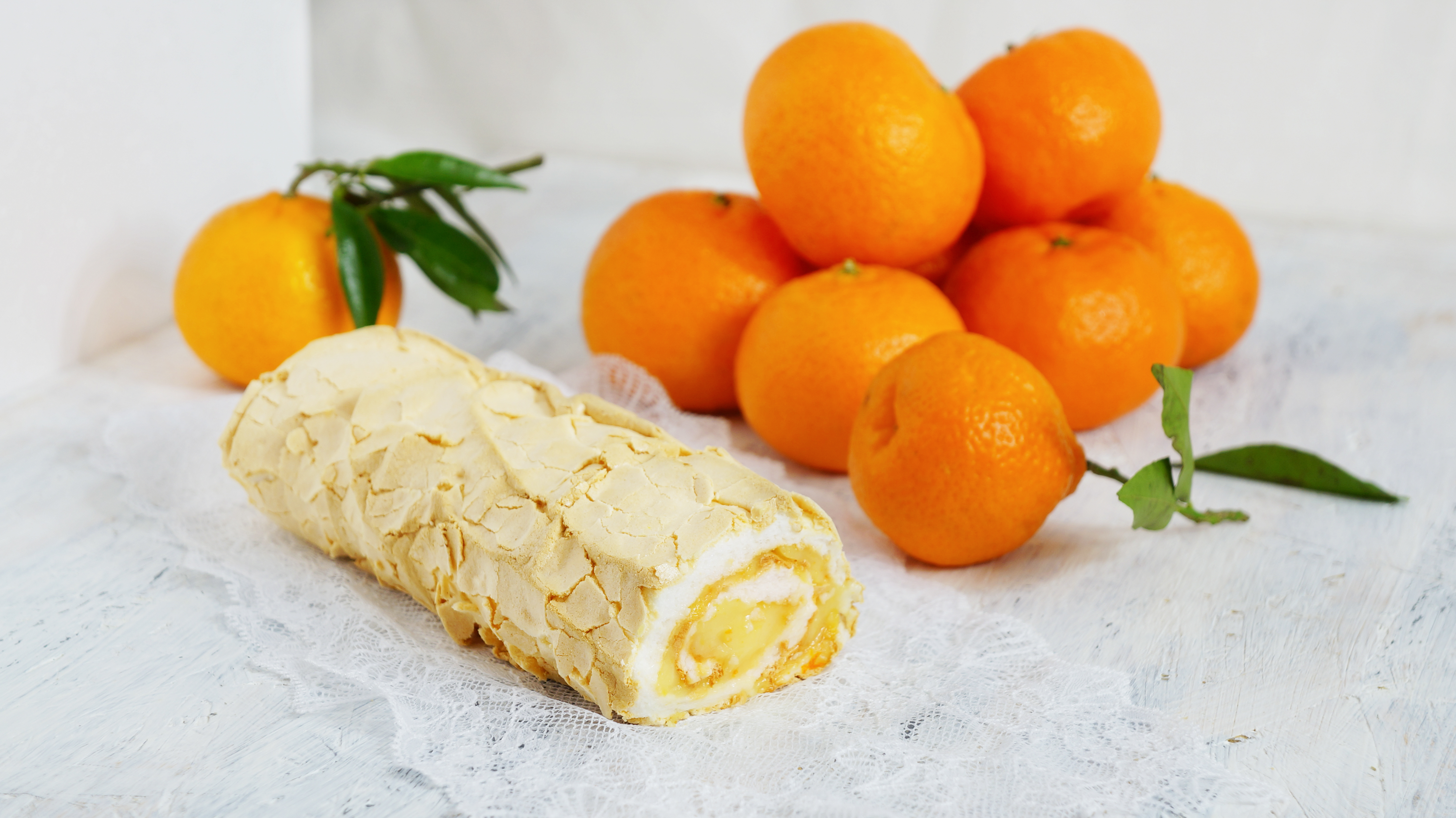 Whip 1/2 pint of cream until soft peaks appear. Spread whipped cream on cooled Pavlova. Sprinkle or arrange the raspberries, kiwi, and mandarin over the meringue. Carefully roll until you are at the end, then roll onto plate, seam down.