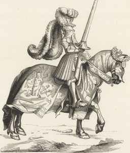 The horses used by knights were a special breed, called destriers, who could manage the great weight of knight and armor and still maneuver on the field. The horses were draped with a cloth called a comparison that covered them from nose to tail, designed in the knight’s colors and emblazoned with his heraldic design.