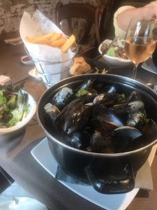 As soon as we got there we checked into our lovely hotel, Hotel d’Orangerie, then headed out to Les Poules Moules, a fabulous restaurant whose specialty is steamed mussels. Absolutely delicious! I couldn’t finish them all. Then we walked around the town, just kind of orienting ourselves to the lay of the land (although Ella’s been there before, it’s still confusing).