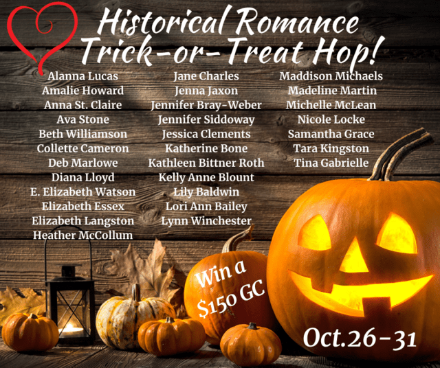 I’ll be participating in a Halloween Trick-or Treat Blog Hop from October 26-31. The Grand Prize will be a $150.00 gift card and to play along you’ll need to visit all thirty historical romance author’s blogs or Facebook pages, playing games or collecting prizes along the way. Readers send the organizers (link to be given on Oct. 26) a list of authors, with the “candy” the author had on their landing page. That list enters you into the grand prize drawing of a $150 gift card to Amazon or online site of their choice.
