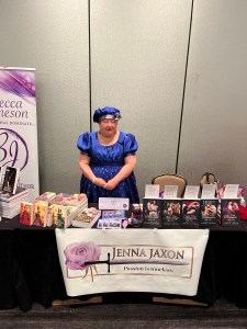 I’ve been at BookLovers Con since Wednesday, having a blast meeting readers, handing out swag, and signing books. Today, at the book signing, I wore my Regency gown that did come in yesterday. Do I look a proper Regency lady? 🙂